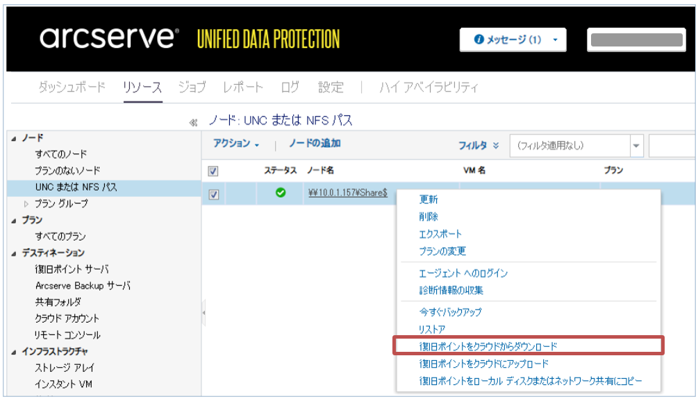 - 「リソース」内の「UNCまたはNFSパス」から、ノードを右クリックし、[復旧ポイントをクラウドからダウンロード]をクリックします。