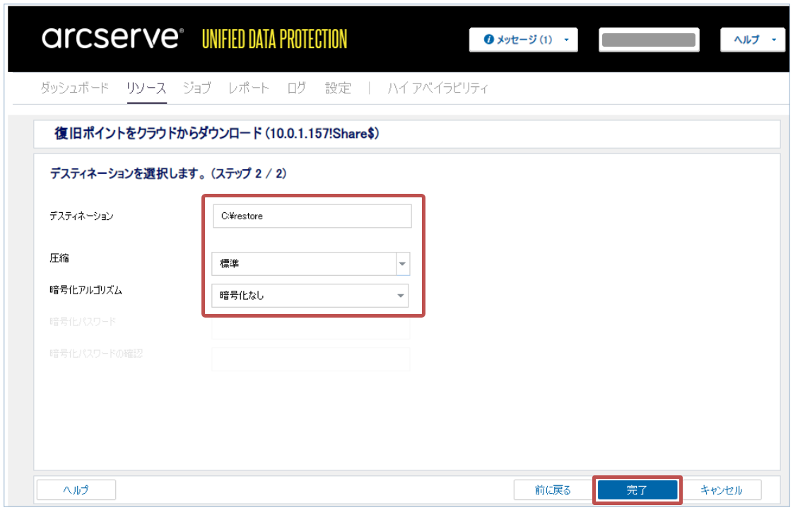 - ダウンロード先を「デスティネーション」に入力し、「圧縮」、「暗号化アルゴリズム」を指定後、[完了]をクリックします。