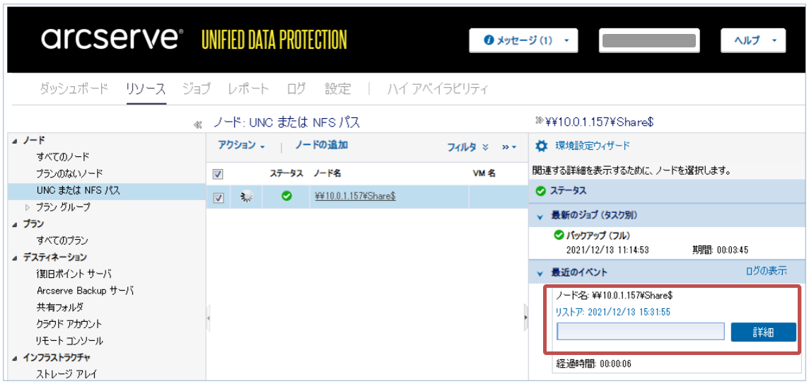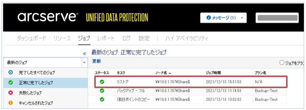 - 「ジョブ」内の「正常に完了したジョブ」で、復旧ポイントのリストアが正常に完了していることを確認します。