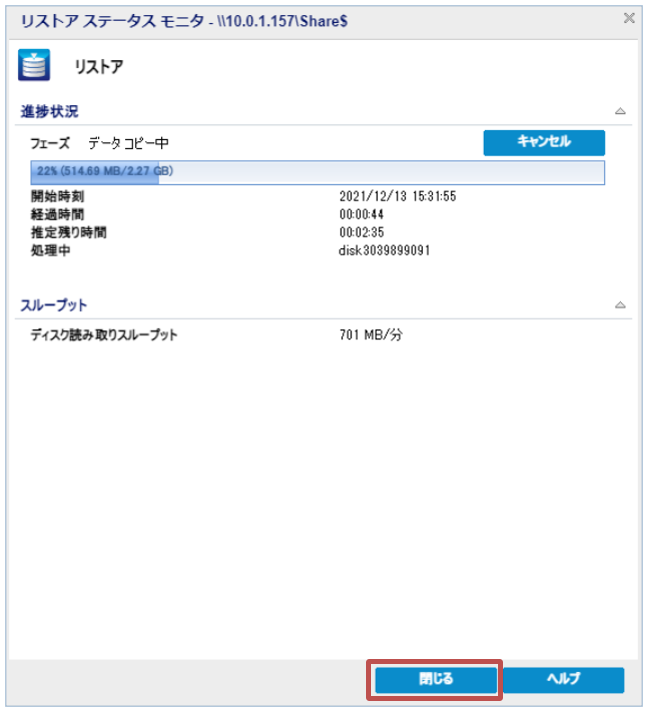 - 復旧ポイントのダウンロードが開始されます。[詳細]をクリックすることで ダウンロード状況を確認できます。