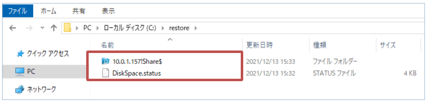 - 手順3の「デスティネーション」で指定した場所に、復旧ポイントがリストアされていることを確認します。
