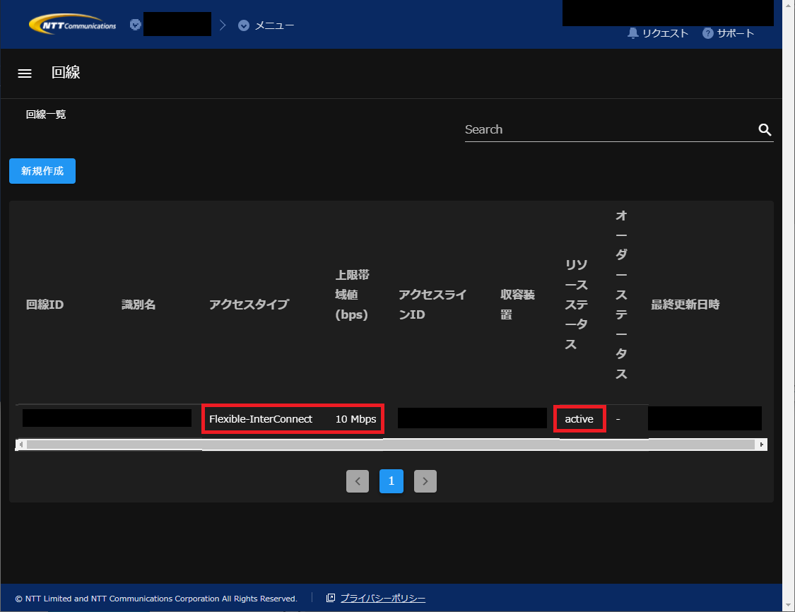 - FIC-Connection S-CON確立後に回線が表示されたこと、リソースステータスが「active」となっていることを確認します。