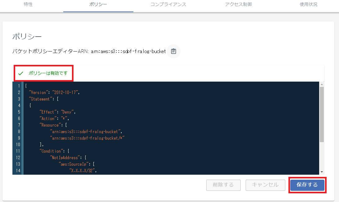 { "Version": "2012-10-17", "Statement": [ { "Effect": "Deny", "Principal": { "AWS": "*" }, "Action": "s3:*", "Resource": [ "arn:aws:s3:::sdpf-fralog-bucket", "arn:aws:s3:::sdpf-fralog-bucket/*" ], "Condition": { "NotIpAddress": { "aws:SourceIp": [ "X.X.X.X/32", #任意のアドレス "Y.Y.Y.Y/32" #任意のアドレス ] } } } ] }