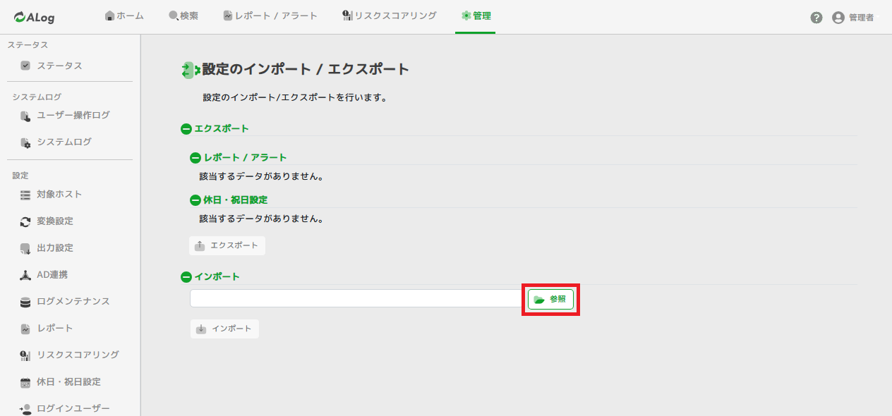 「管理」>「設定のインポート/エクスポート」の画面で「参照」をクリックします。