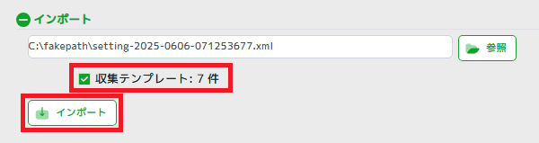 テンプレートファイル(xml)を選択して「収集テンプレート」のチェックブックスをチェックの上「インポート」をクリックしてテンプレートを登録します。