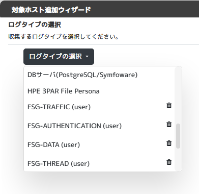 登録できたテンプレートは対象ホストの追加時に「ログタイプの選択」で確認できます。