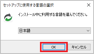 「セットアップに使用する言語の選択」で「日本語」を選択し、「OK」をクリックします。