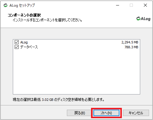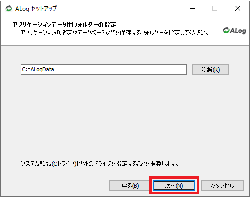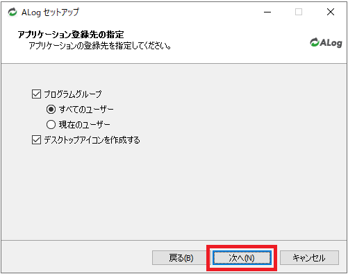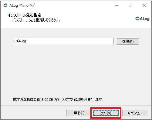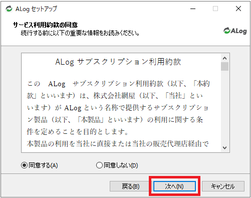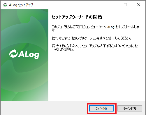 「ALogセットアップウィザードの開始」画面で「次へ」をクリックします。