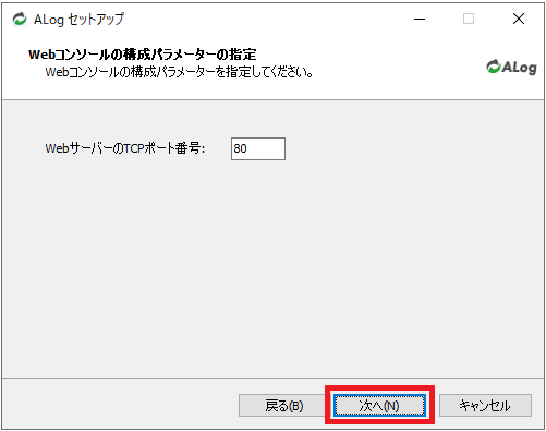 「Webコンソールの構成パラメーターの指定」画面で画面で「WebサーバのTCPポート番号」が「80」であることを確認し、「次へ」をクリックします。