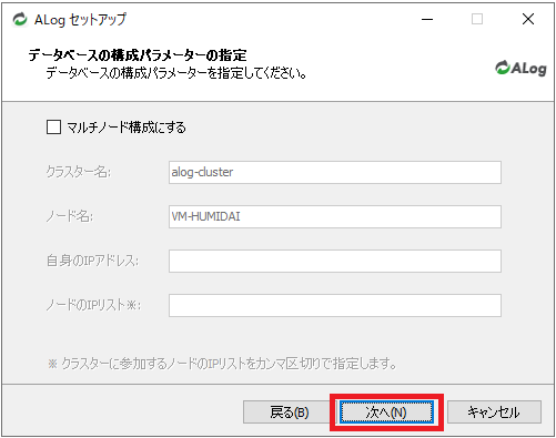 「データベースの構成パラメーターの指定」画面でマルチノード構成するをチェックせずにそのまま「次へ」をクリックします。