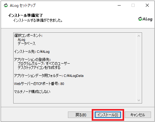 「インストール準備完了」画面で設定内容を確認し、「インストール」をクリックします。