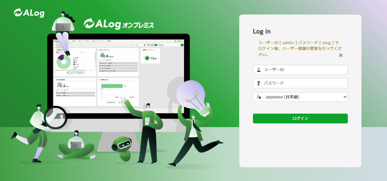 - 初期ログイン情報は以下になります。ユーザID:adminパスワード:alog