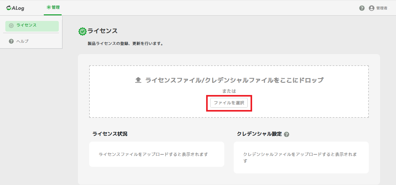 Webコンソールにログインするとライセンス認証画面が表示されます。「ファイルを選択」をクリックしてライセンス登録を行います。