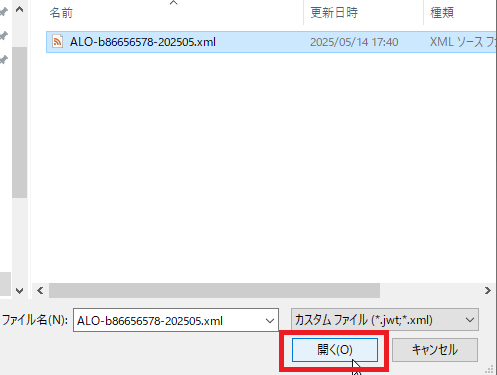 Alogライセンスファイル(xmlファイル)を選択して「開く」をクリックします。