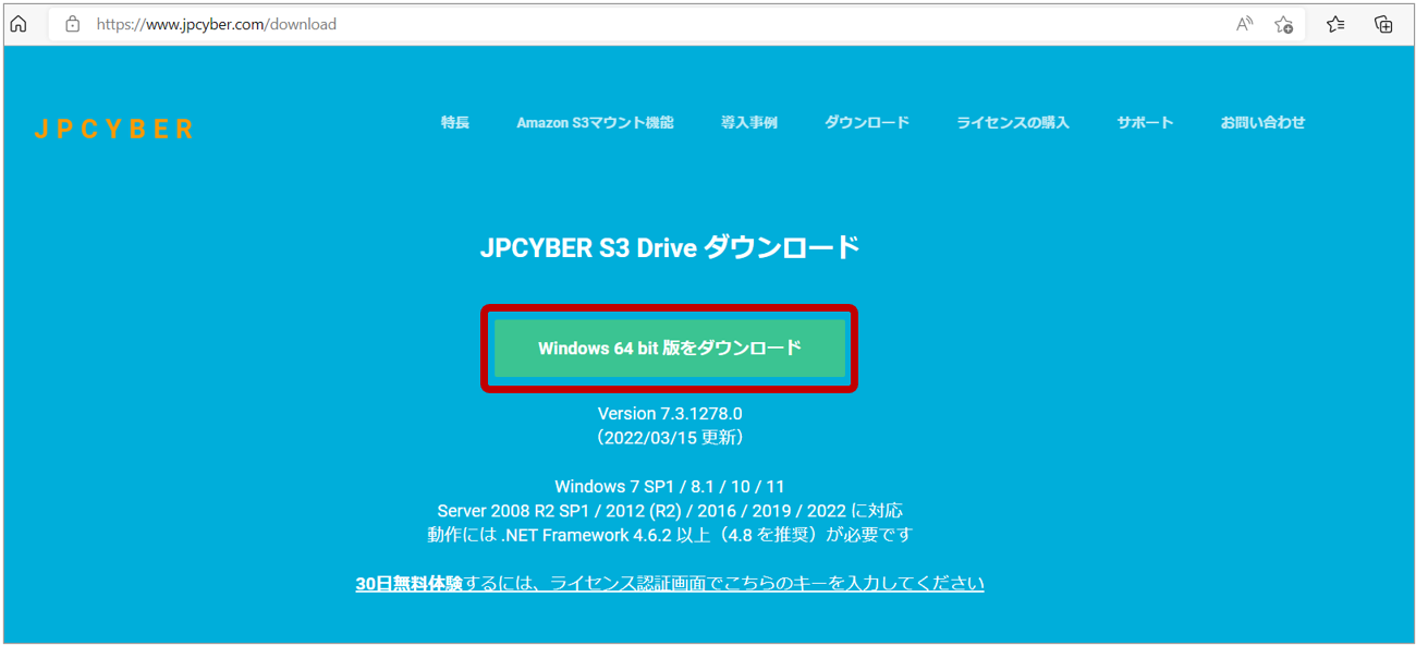 - 「https://www.jpcyber.com/download」から30日無料体験版をダウンロードします。※正式なライセンスが必要な場合は、「https://www.jpcyber.com/buy」をご確認ください。