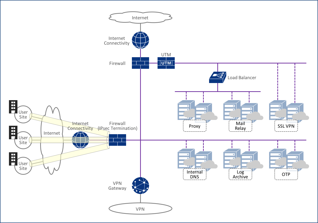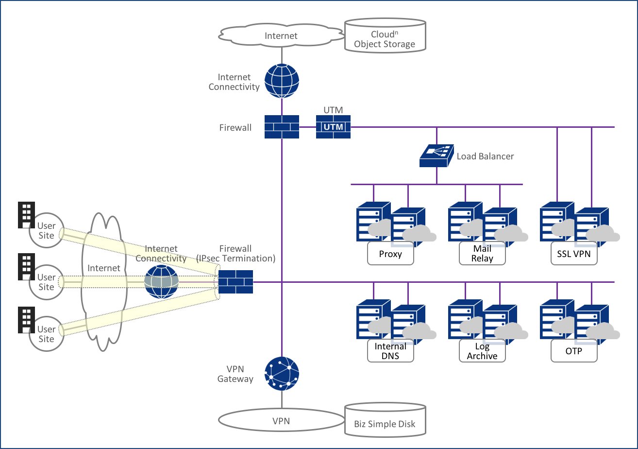 SSL-VPNを用いて、インターネットからクラウド環境およびVPN内へのリモートアクセスを行う。