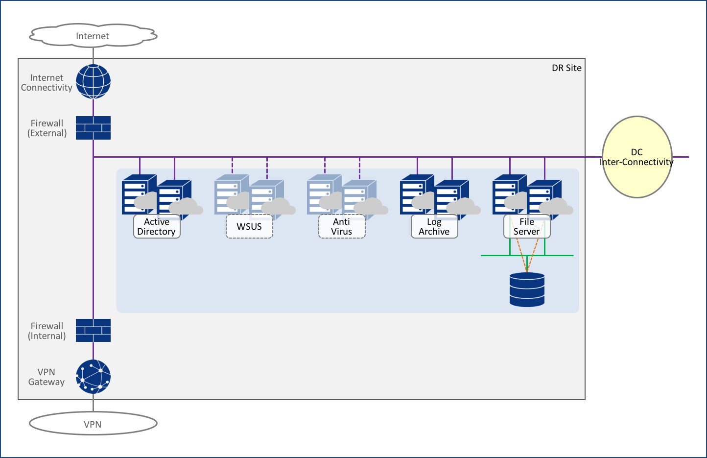 その他のWSUSサーバー、ウイルス対策管理サーバー等は、負荷分散目的があればDRサイトに構築しアクティブ化しておき、負荷分散目的がなければ通常時はボリュームのみの保存とし、DRサイトのコスト低減を図る。