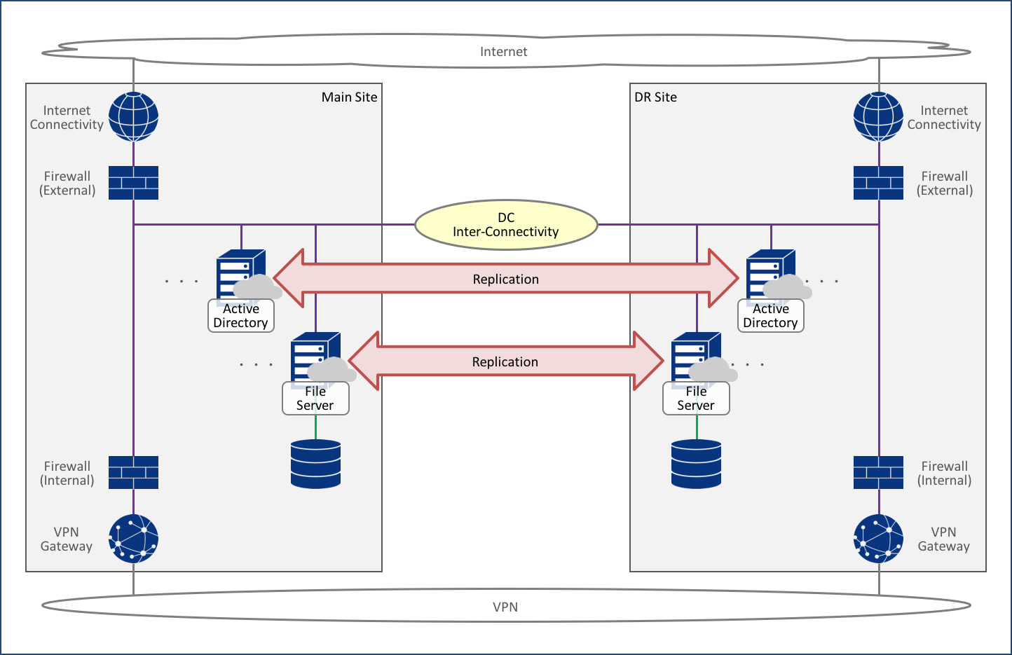 ADサーバーにてメインサイトとDRサイト間で常時レプリケーションを行うと、定常的にサイト間でトラフィックが生じることとなります。このレプリケーション用のトラフィックを処理するために、クラウド/サーバー リージョン間接続を利用します。また、メインサイトのファイルサーバーの物理障害などによるデータ損失を防ぐために、DRサイトのファイルサーバーに対して定期的にデータ同期を行うことで、バックアップ目的でDRサイトを活用することも可能です。これにより、安価にサイト間で負荷分散およびDRを実現することができます。