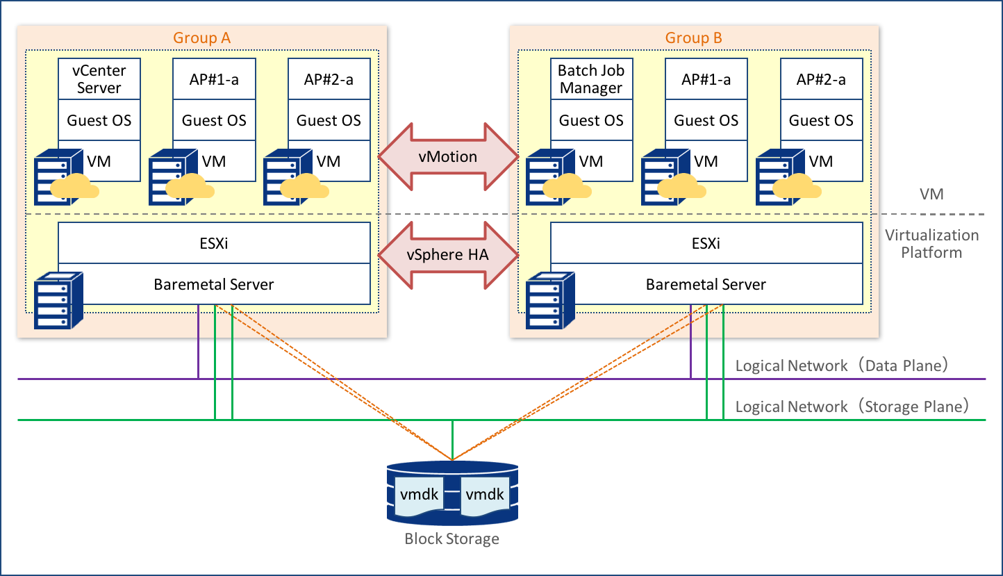 APサーバーの保護を考えた場合、仮想化プラットフォームが提供するHA機能(vSphere HAなど)やLive Migration機能(vMotionなど)を活用することで、システムの可用性・信頼性の向上を図ります。システムの重要性に応じて、ホストの冗長度(N+1構成, N+2構成など)やVMが動作するホストの物理分離もお客さまにて調整することが可能です。本構成例では、本番用に2台のベアメタルで動作可能な想定としています。縮退時に備えてどのようにサーバー台数を用意し、VMを収容しておくかもお客さまが自由に設定することができます。