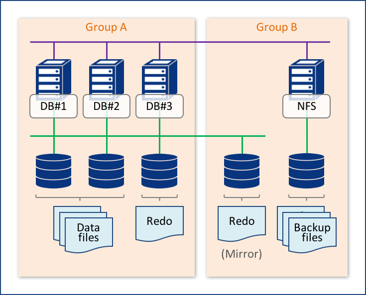 Oracle RACのような複数台のサーバーから共有ディスクを用いたAct-Actのデータベースを構成するためには、ブロックストレージが提供するLUN(Logical Unit Number、サーバーから1台の物理ハードディスクとして認識される単位)を利用します。ブロックストレージは2IOPS/GBまたは4IOPS/GBの性能となるため、容量と必要なIOPSからLUNのサイズを決定することで、大規模なDBにも適用可能な高いI/Oパフォーマンスを利用することができます。Redoログや制御ファイルのようなDBMS(DataBase Management System、データベース管理システム)がミラーファイルを持てる対象については、別々のグループを指定して物理的に異なるストレージにファイルを置く構成とすることで、耐障害性を高める構成とすることができます。