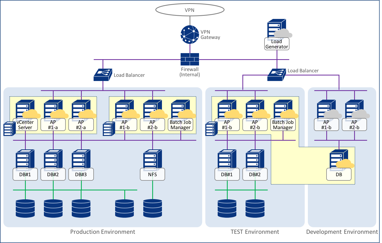 本番、検証、開発の3面を用意。本番系と開発検証用では物理マシンリソースを分離し、本番系は専用の環境を準備