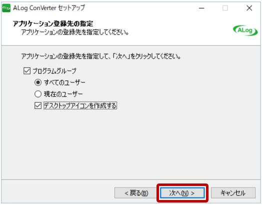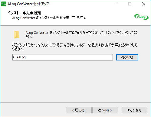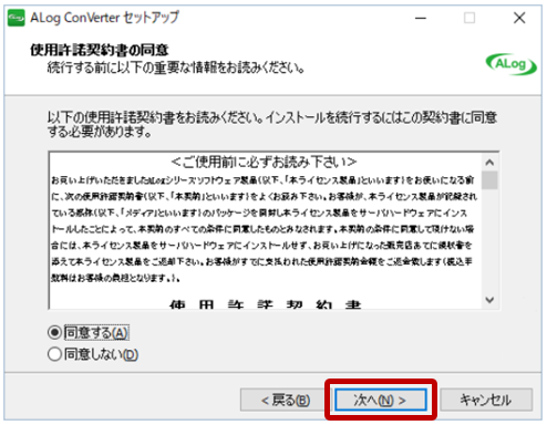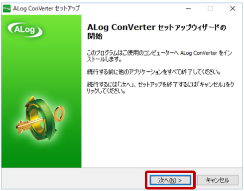 「ALog ConVerter セットアップウィザードの開始」画面で[次へ]をクリックします。
