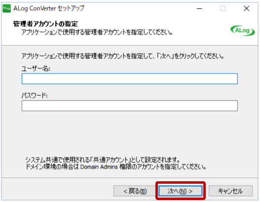 - 「管理者アカウントの指定」画面で管理者アカウントのユーザー名とパスワードを入力し、[次へ]をクリックします。