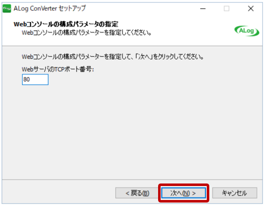 「Webコンソールの構成パラメータの設定」画面で「WebサーバのTCPポート番号」が「80」であることを確認し、[次へ]をクリックします。