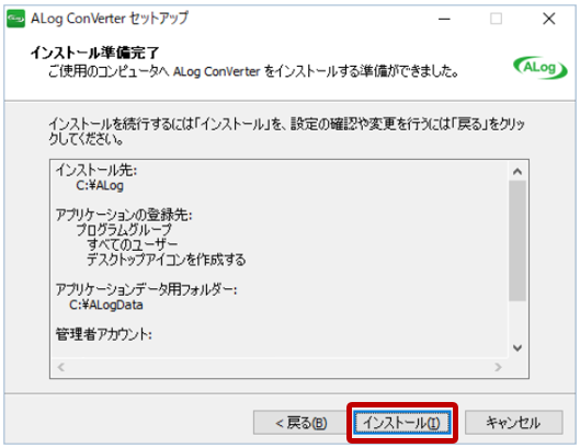 ダウンロードした「alog.zip」を解凍し、「setup.exe」を実行します。