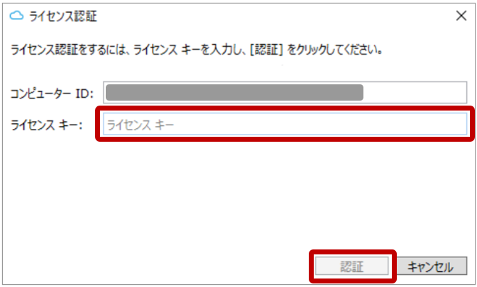 - 「ライセンスキー」にライセンスキーを入力し、[認証]をクリックします。