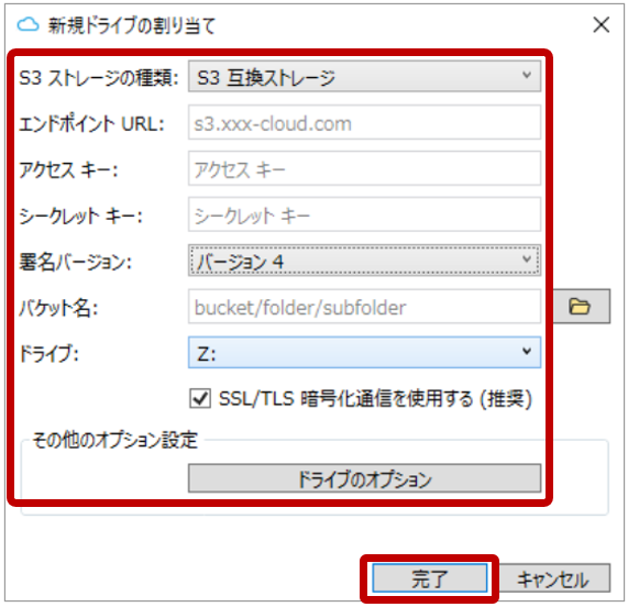 - 下記の「表: JPCYBER S3 Driveの設定値」に記載の値を入力し、[完了]をクリックします。