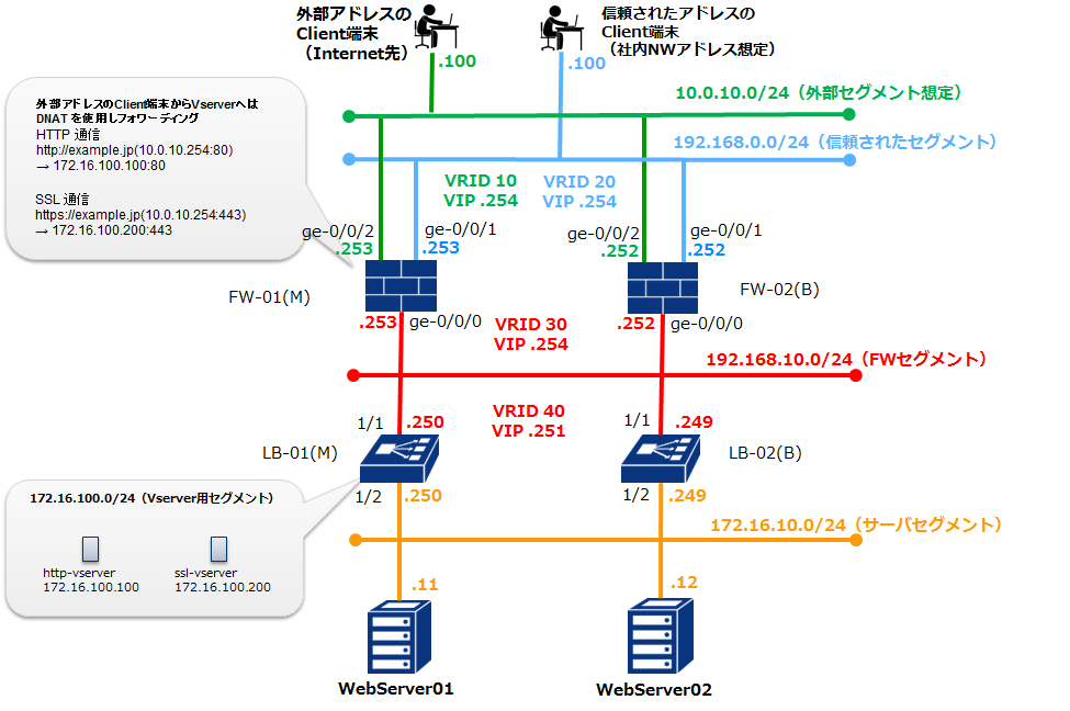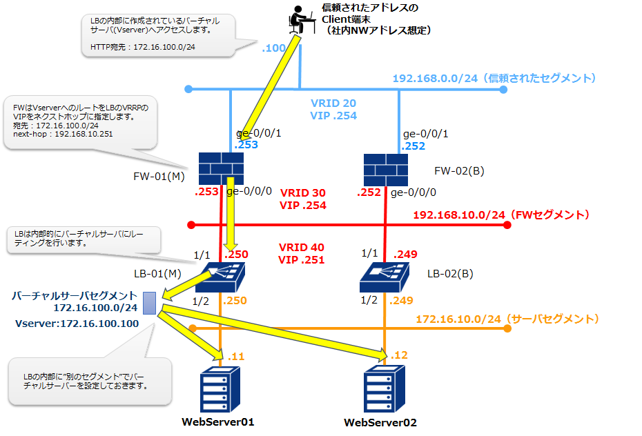 外部セグメントからはLBのバーチャルサーバーのIPアドレスではなく、FWのグローバルIPアドレスにアクセスさせ、NAT変換で宛先をバーチャルサーバーのIPアドレスに変換します。