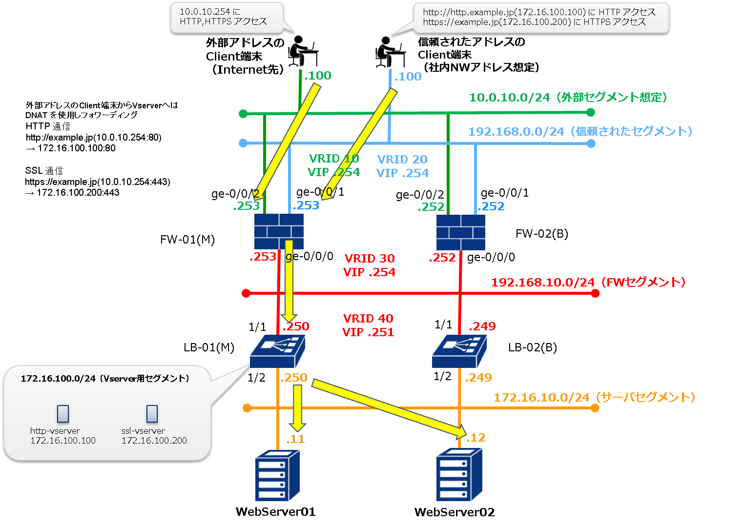 HTTP/HTTPS用のバーチャルサーバーを立て、2台のWEBサーバーにラウンドロビンで通信を分散します。HTTPSはSSLオフロードを行います。