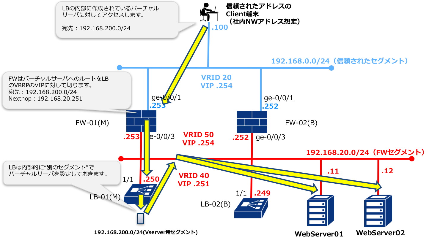 外部セグメントからはLBのバーチャルサーバーのIPアドレスではなく、FWのグローバルIPアドレスにアクセスさせ、NAT変換で宛先をバーチャルサーバーのIPアドレスに変換します。