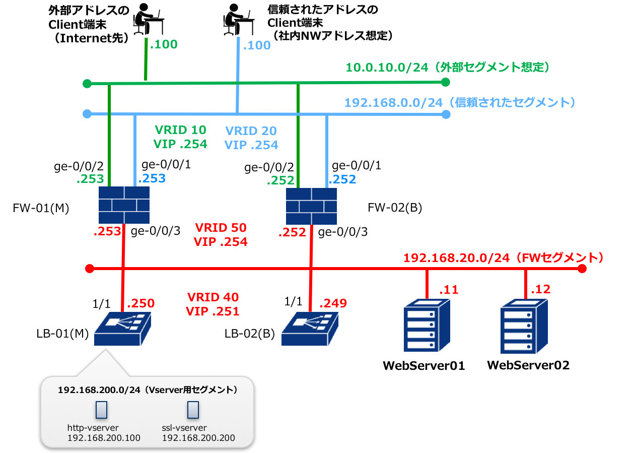 VRRPを使用して2台の冗長構成とします。すべてのネットワークセグメントでVRRPを設定します。