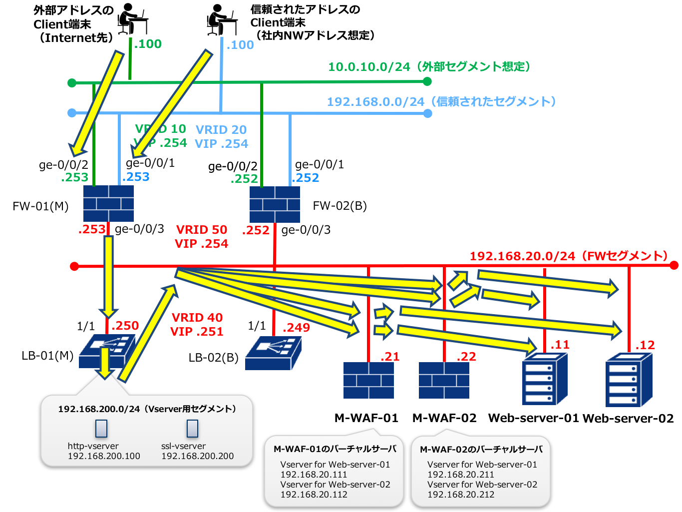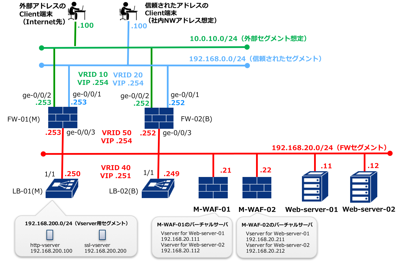 SDPFのLB(NetScalerVPX)では、1つのインターフェイスに対して登録可能なVRRP設定(仮想IPアドレスとVRRPグループIDのペア)は1つであり、複数のVRRPグループの登録はできません。代替方法としてVRRP用に登録したVirtual IPアドレス(以下VIP)とは別のセグメントに仮想IPアドレスを登録し、それを振り分け対象IPアドレスに設定することで複数VIPを冗長化させることができます。本構成はこの方法で冗長構成としています。