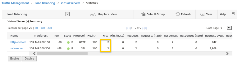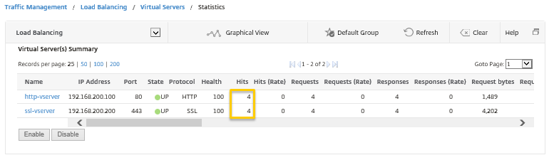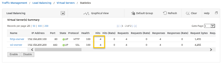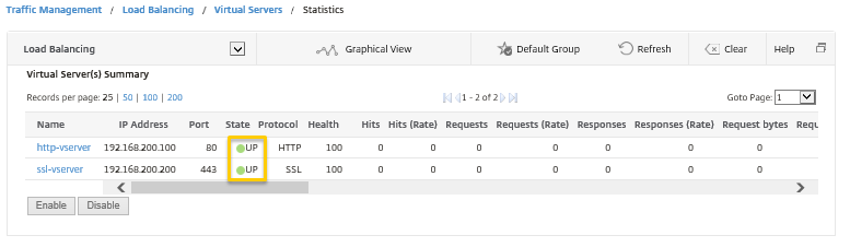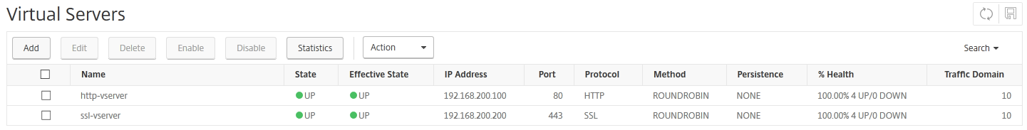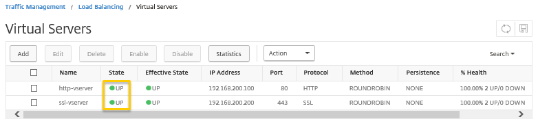 メニューの[Traffic Management]―[Load Balancing]―[Virtual Servers]―[statistics]を選択し、バーチャルサーバーの状態がそれぞれUPであることを確認します。