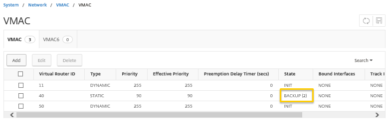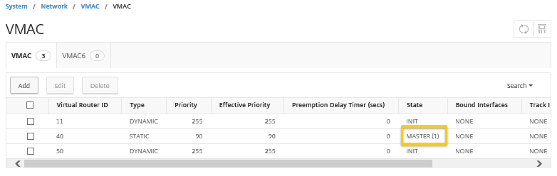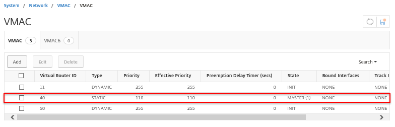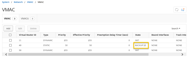 メニューの[System]-[Network]-[VMAC]を選択し、VRRP設定を確認します。