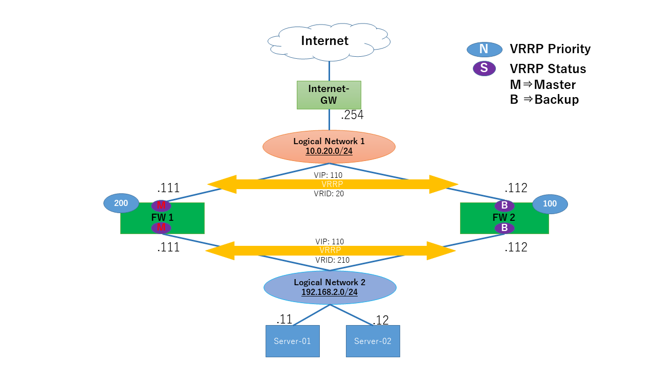 Server-01、02がFWを経由し、インターネットゲートウェイへアクセスできるよう構成しています。 Server-01、02のゲートウェイとして、FW01、02でVRRPを設定した冗長構成としています。 Server-01、02からインターネットゲートウェイへの通信をFWでSNATする構成としています。