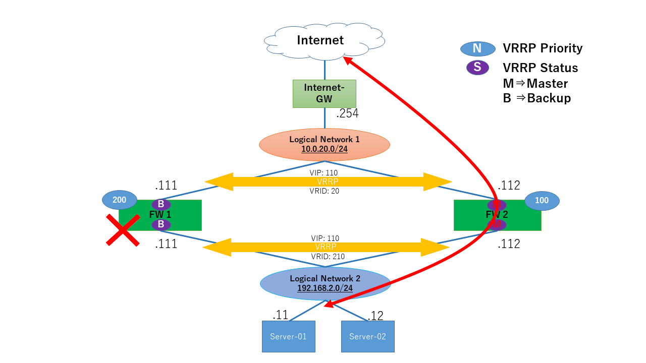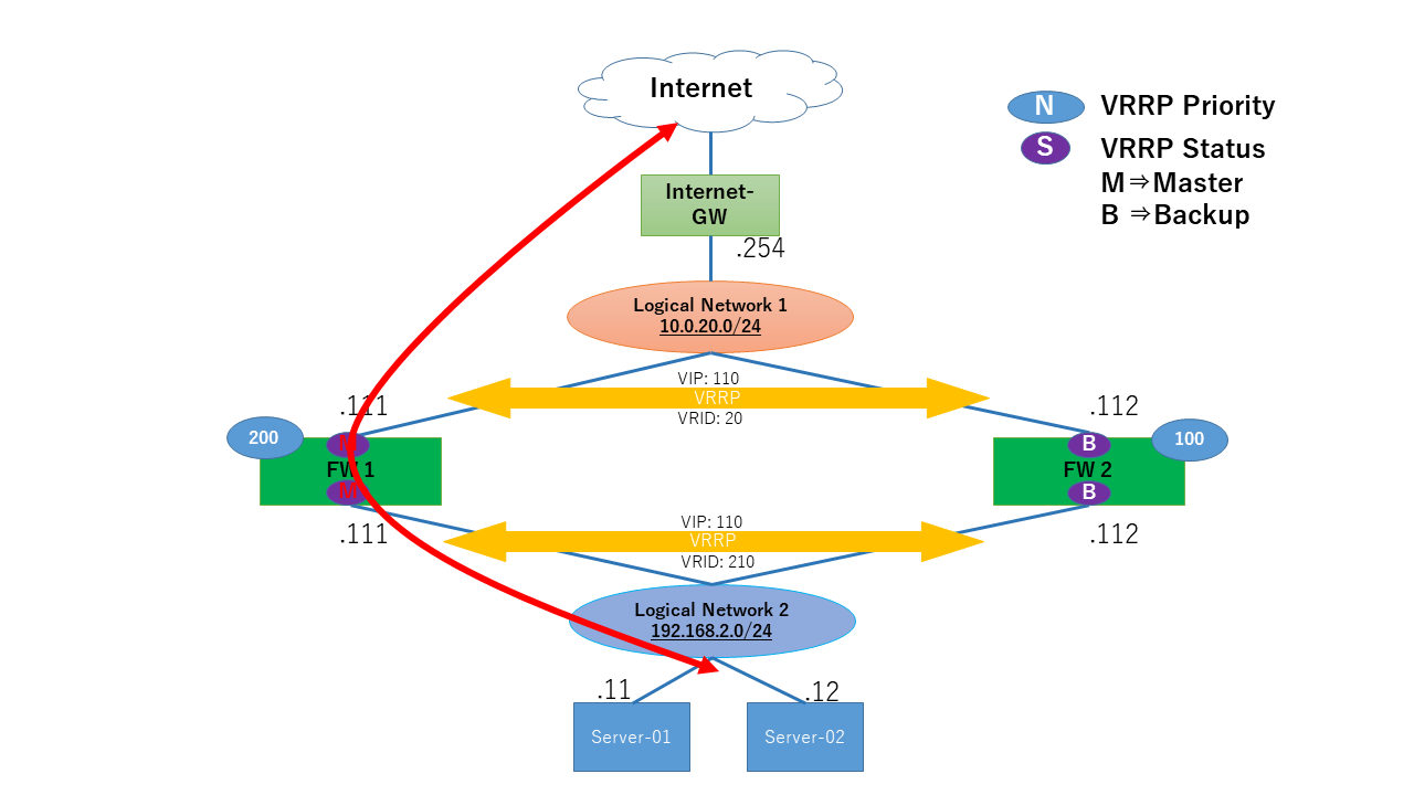 Server-01、02は正常時、MasterであるFW01を通してインターネットゲートウェイへ通信します。