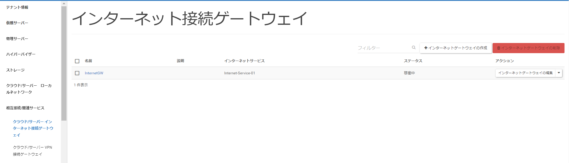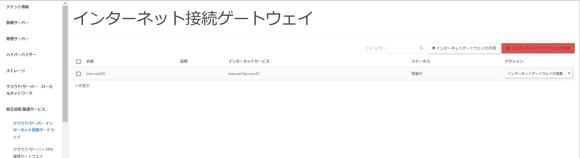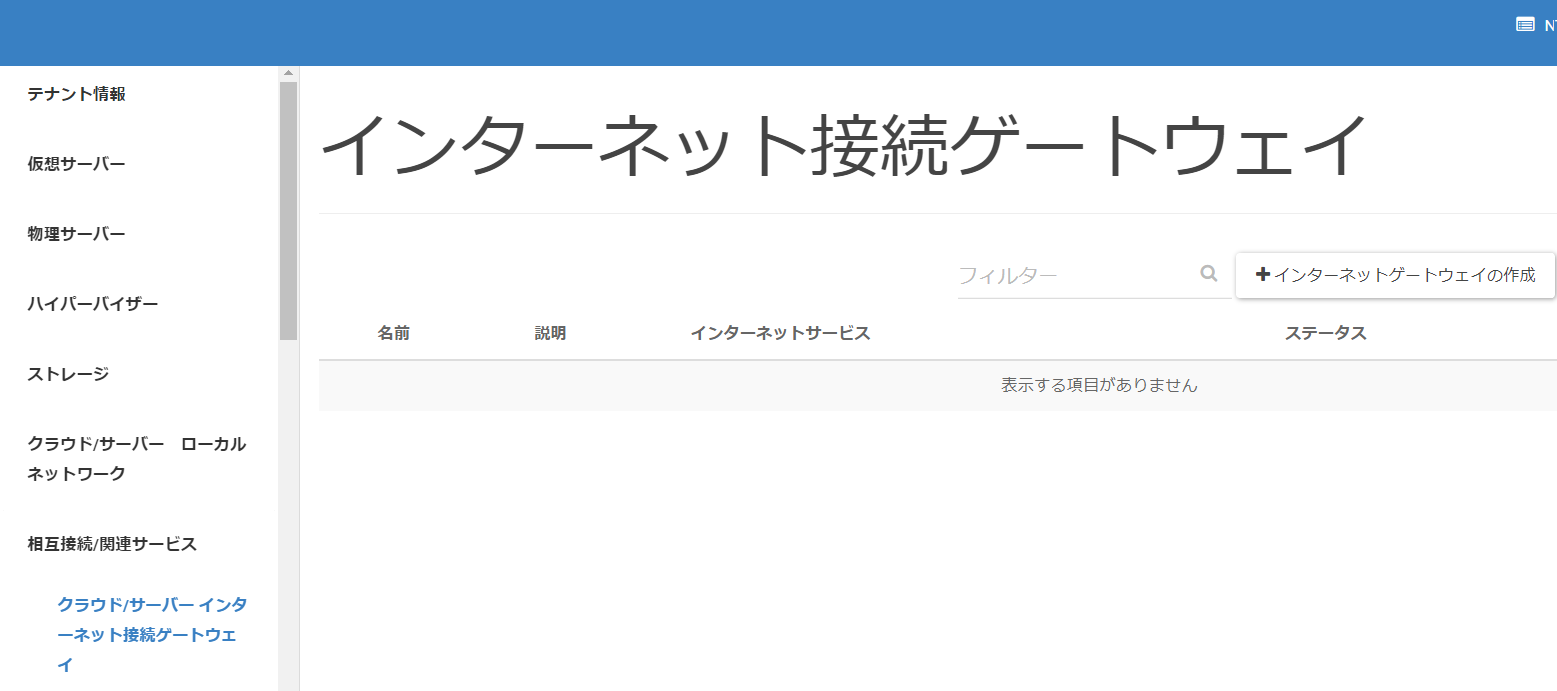 メニューリストの中から[ネットワーク]>[クラウド/サーバー インターネット接続ゲートウェイ]と遷移し、[インターネットゲートウェイの作成]をクリックします。