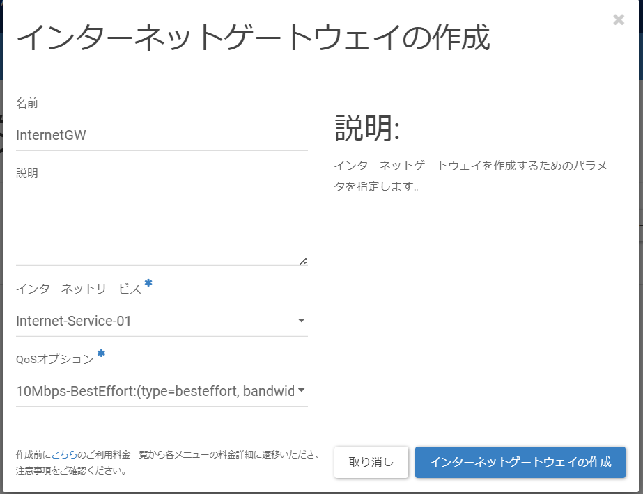 「インターネットゲートウェイの作成」画面に遷移後、以下の値を入力し、[インターネットゲートウェイの作成]をクリックします。
