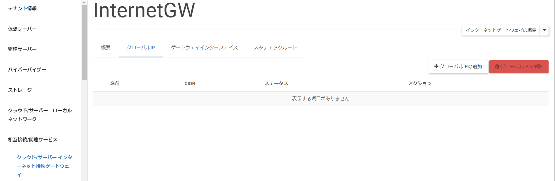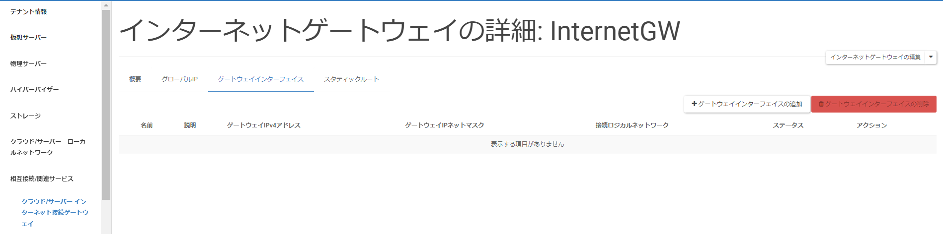 「インターネットゲートウェイの詳細」画面に遷移後、[ゲートウェイインターフェイス]タブをクリックし、[ゲートウェイインターフェイスの追加]をクリックします。
