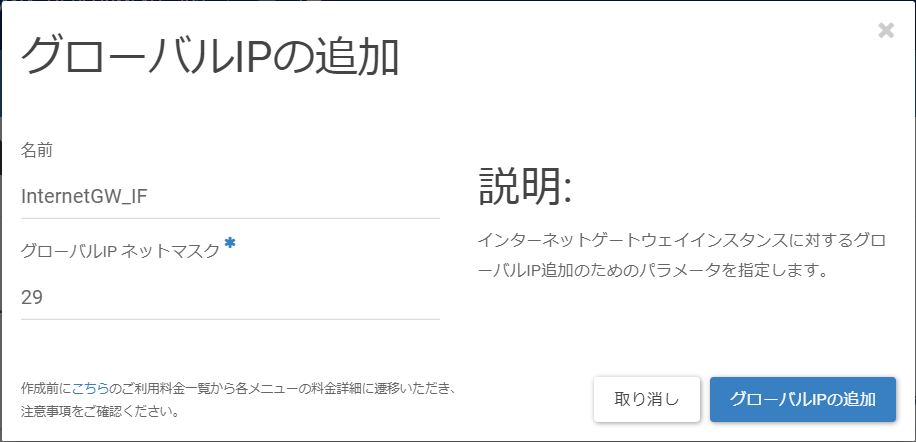 「グローバルIPの追加」画面に遷移後、以下の値を入力し、[グローバルIPの追加]をクリックします。