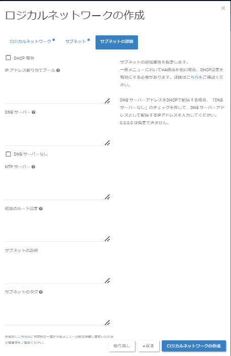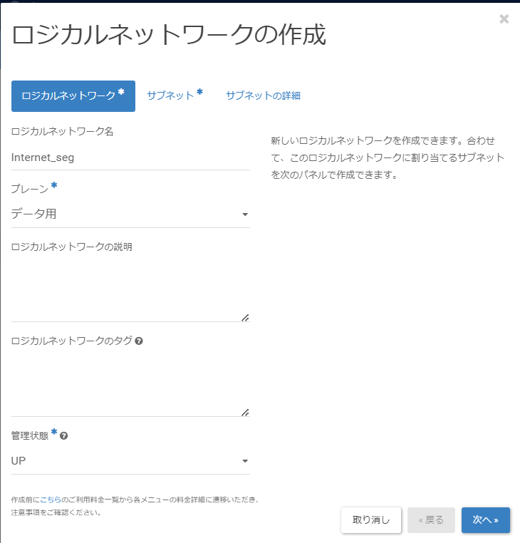 「サブネットの詳細」画面に遷移後、以下の値を入力し、[次へ]をクリックします。