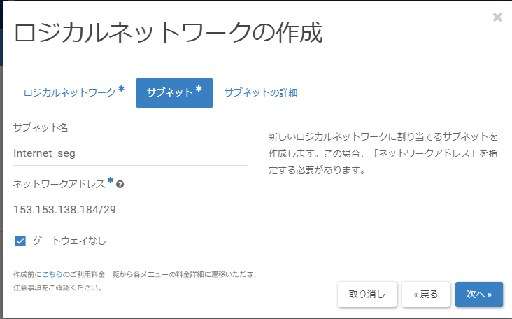 「サブネット」画面に遷移後、以下の値を入力し、[次へ]をクリックします。