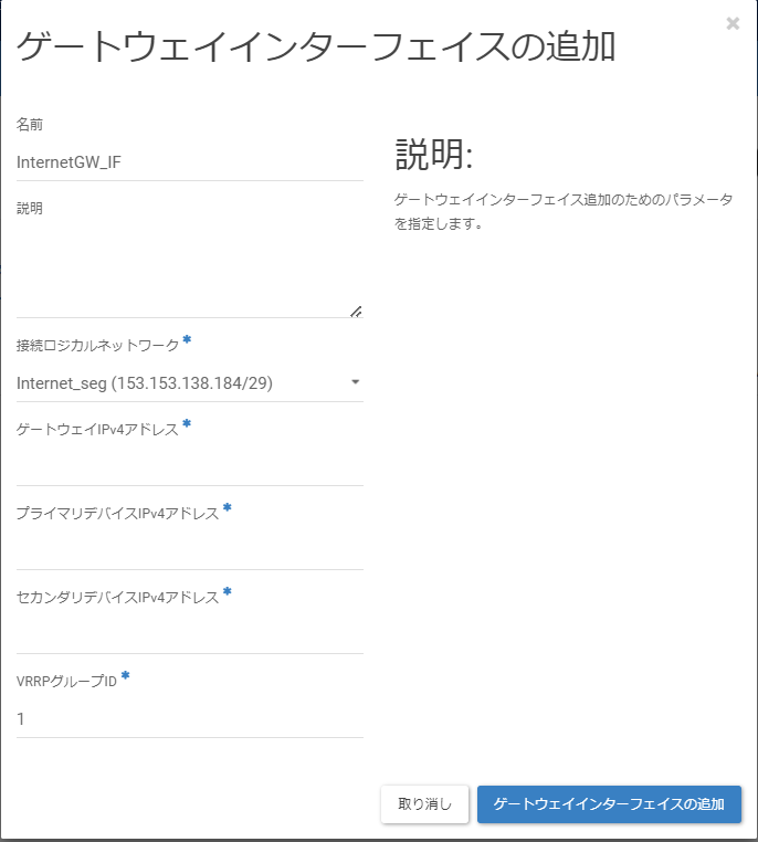「ゲートウェイインターフェイスの追加」画面に遷移後、以下の値を入力し、[ゲートウェイインターフェイスの追加]をクリックします。