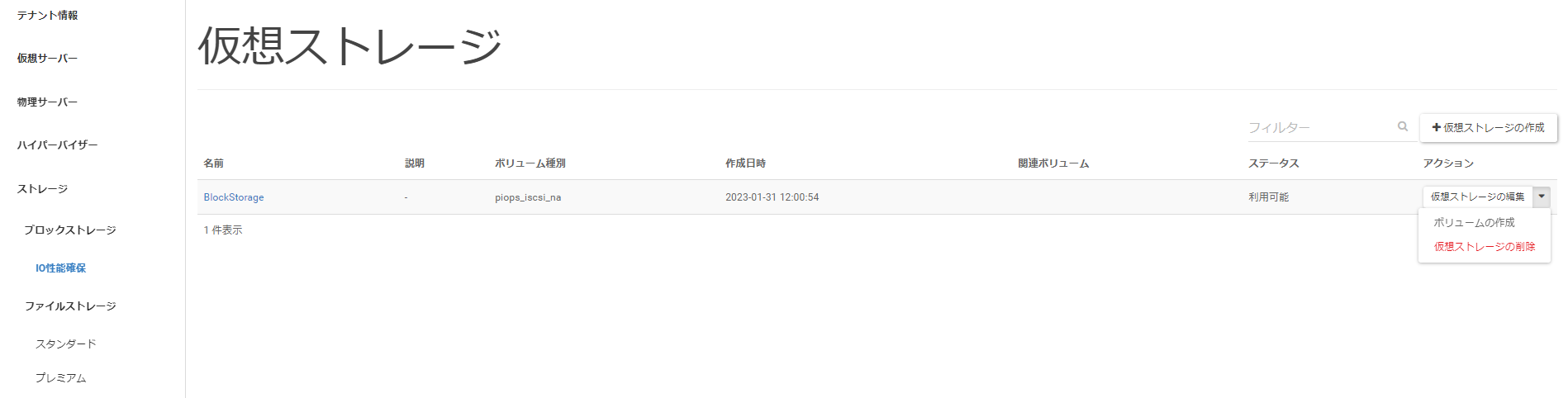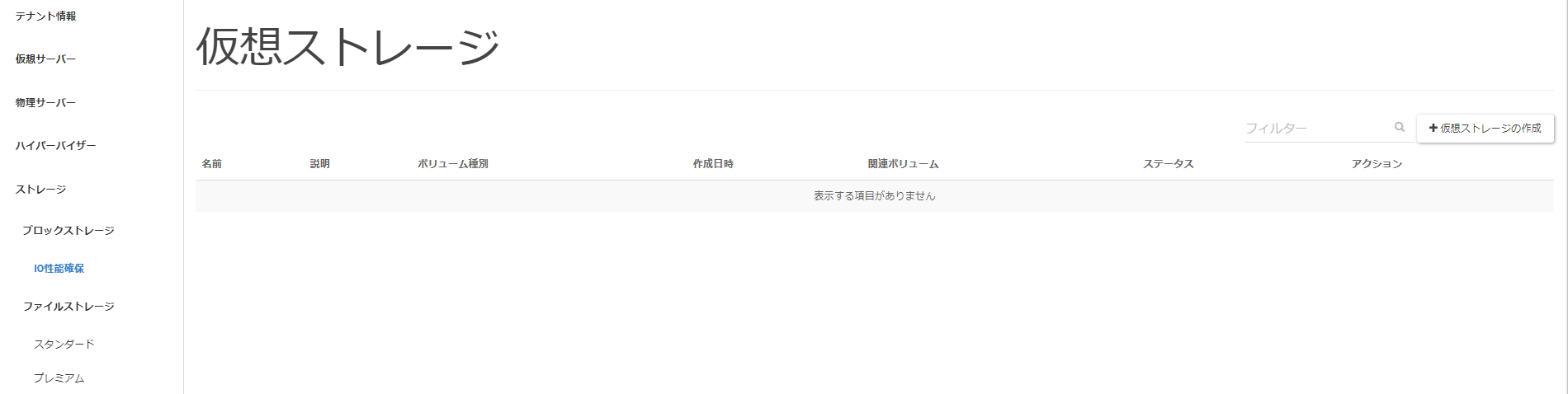 メニューリストの中から[ブロックストレージ]>[IO性能確保]と遷移し、[仮想ストレージの作成]をクリックします。