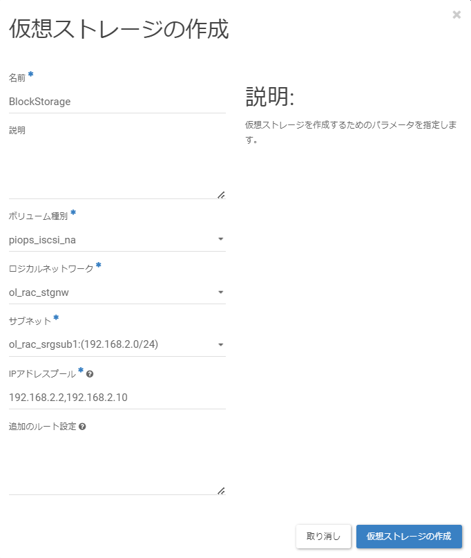 「仮想ストレージの作成」画面に遷移後、以下の値を入力し、[仮想ストレージの作成]をクリックします。