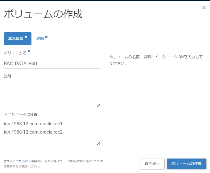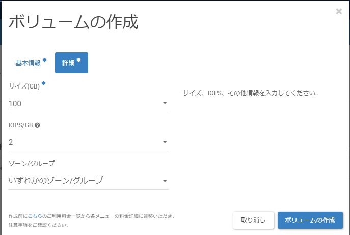 「ボリュームの作成」画面の[基本情報]タブに遷移後、以下の値を入力し、[詳細]タブをクリックします。